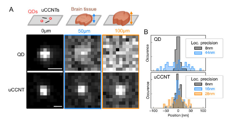 Les chercheuses et chercheurs ont démontré l’utilité de ces nanotubes en les injectant dans des tranches de cerveau de souris. Leur luminosité permet un suivi précis, en 3D, du déplacement des particules individuelles jusqu’à 100 μm de profondeur, bien davantage que les boîtes quantiques (cf. illustration).
