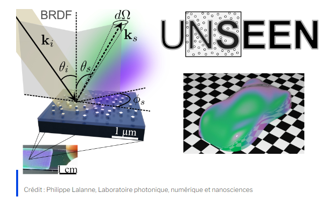 The UNSEEN project aims to create new visual appearances by considering metasurfaces that don’t exist in nature, for example by exploiting the many degrees of freedom offered by disordered sets of resonant nanoparticles. The project could have spin-offs in many fields such as, for example, coatings for the fine and applied arts. This multidisciplinary project, which will begin in September 2023, requires bringing together skills in complex media, nanophotonics, computer-graphics, electromagnetic modeling and nanofabrication. Several postdoc and PhD positions are available.